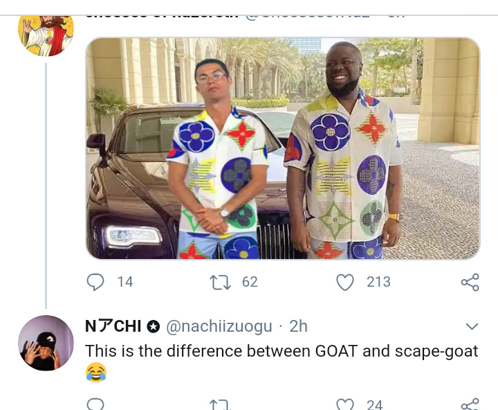 Different social media users has taken the same platform to mock the Juventus star for wearing same clothes Hushpuppi has already wore in the past.